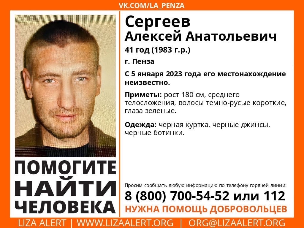 В ориентировке указано, что пропал Алексей Сергеев, ему 41 год. Больше недели, а именно с 5 января, о его местонахождение неизвестно. Мужчина среднего телосложения, рост - 180 сантиметров, с темно-русыми волосами и зелеными глазами. На нем были надеты черная куртка, черные джинсы и черные ботинки. Сообщить любую информацию о его местонахождении можно на горячую линию по телефону 88007005452.
