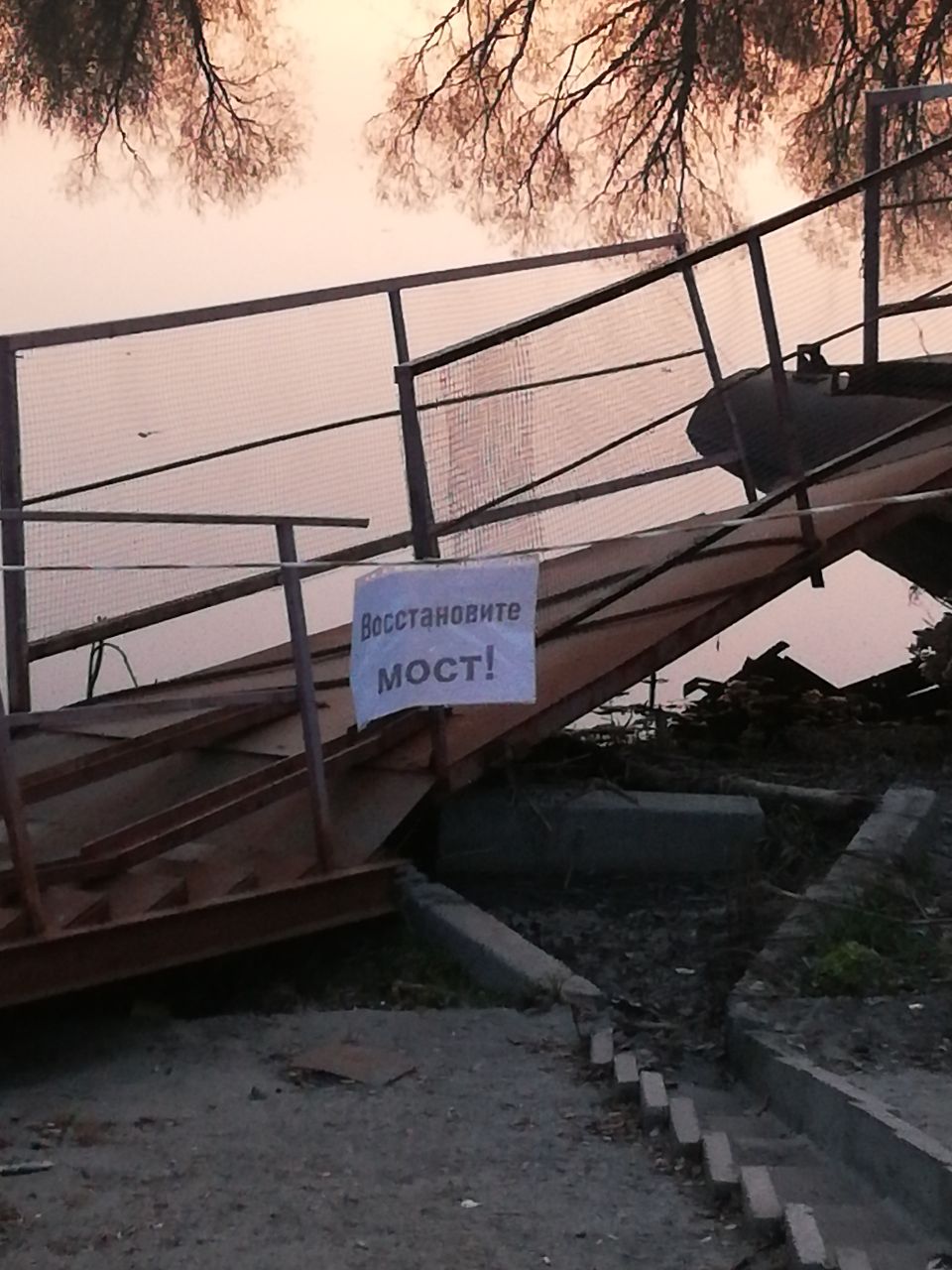Она попросила вернуть строение, ведь вода спала, а другая транспортная доступность плохая, большинство ходят до центра пешком. Она также к своей жалобе прикрепила фото, который видно, что мост лежит на берегу. Кто-то из жителей уже повестил на нее плакат с подписью: «Восстановите мост!».