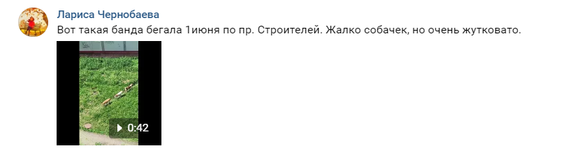 Через некоторое время я ещё раз обращаюсь туда, сфотографировала им из окна стаю, где лежат указала. Через некоторое время приходит ответ, такого же содержания. Но собаки как были, так ещё и увеличилась их численность. В прошлом году мужчине прокусила бродячая собака вену на бедре, его на скорой увезли, ели спасли. Была полиция, эту собаку забрали. Но остальные остались. В СМИ информация недавно прозвучало, что на отлов собак выделяют ещё больше денег. Но мое мнение, что они на это не пойдут, а осядут в чьих-то карманах. Собаки в каждом районе города. Если бездомные кошки — это грязь и запах, то собаки реальная угроза.»